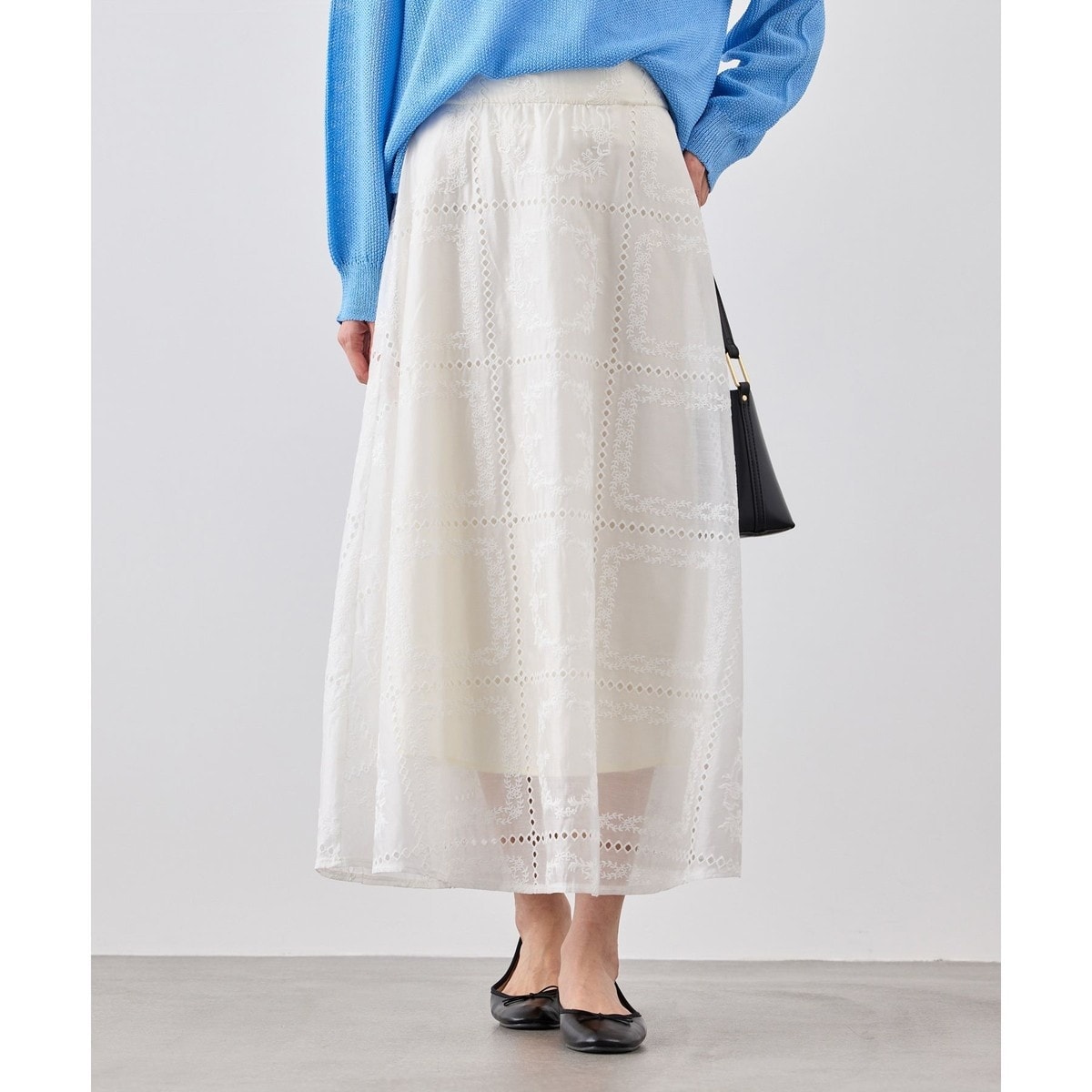 ・シンプルなニットやカットソーを合わせて、スカートの刺繍とシアー感を引き立てた着こなしも◎
