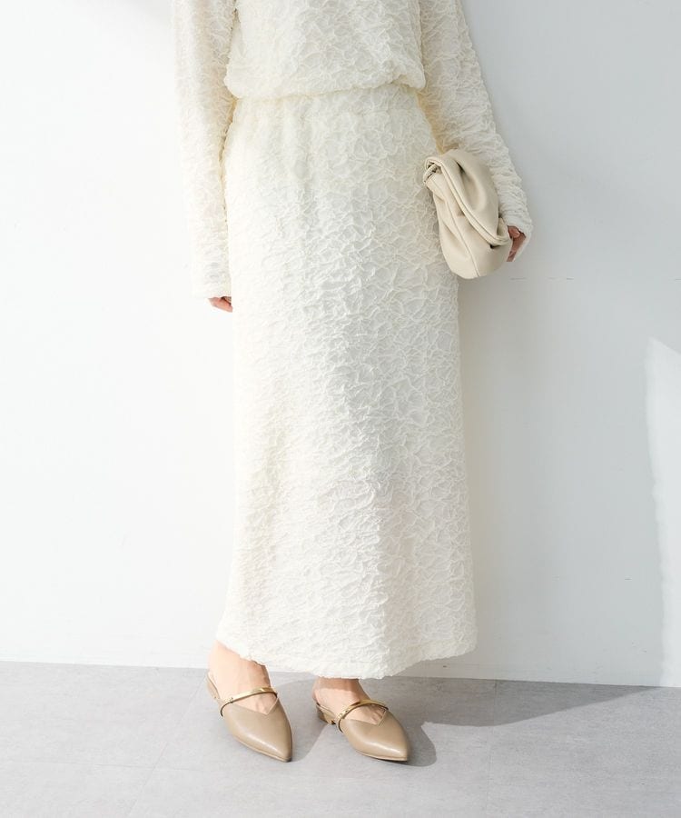 凹凸のあるポコポコとした表面感が、シンプルな装いにさりげない華やかさを添える一枚です。縦のラインを意識したIラインシルエットが、自然にすっきりとした印象を演出します。柔らかい素材感で肌当たりがよく、長時間の着用でもリラックスして過ごせるのが魅力です。ウエストは程よくフィットし、締め付け感が少ないため日常使いにもぴったりです。トップスを選ばず合わせやすく、カジュアルからきれいめまで幅広いコーデに活躍します。立体的な表情がコーデのアクセントになり、いつもの着こなしを新鮮に見せてくれます。季節を問わず取り入れやすく、着回し力を重視したい方にもおすすめです。
