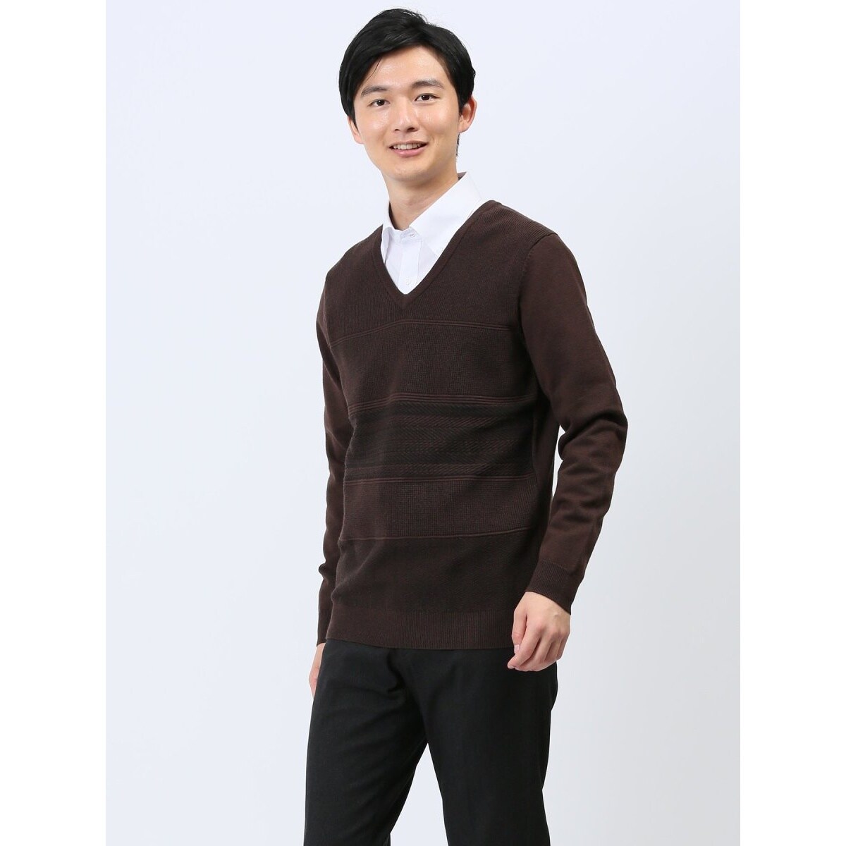 秋冬の大人の着こなしに欠かす事の出来ない、Vネックのニットプルオーバーです。前身頃の上品なパネルボーダー柄がポイント。(袖と後身頃は無地の天竺編みです。)秋はカットソーや布帛シャツとの重ね着に、冬はインナーとアウターの中間着として防寒対策にマストなアイテムです。