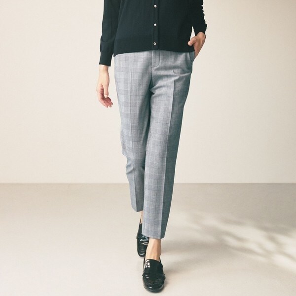 ご家庭で手洗い洗濯可能なウールライク素材です。肌ざわりの滑らかな裏起毛の2WAYストレッチです。高級感のある先染めのグレンチェックです。