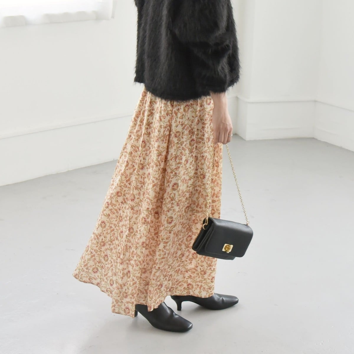 コーディネートのアクセントになる花柄がポイントのフレア スカート。