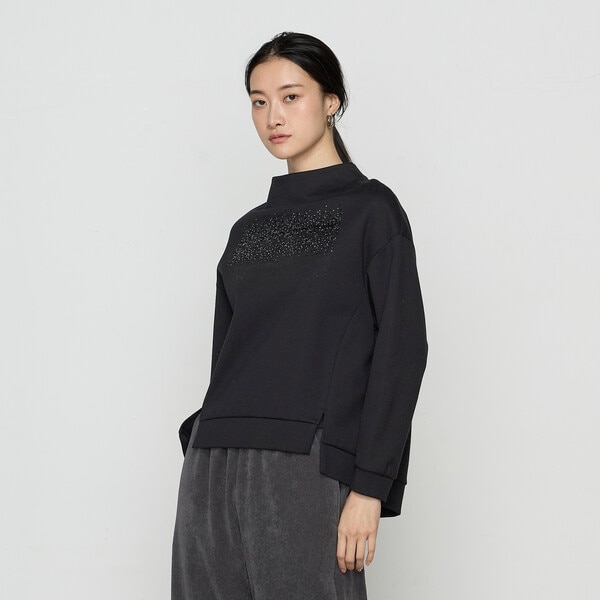 メッシュ状の箔プリントの上に二色のスパンコールをグラデーションで配置した、キラキラと華やかなプルオーバーです。