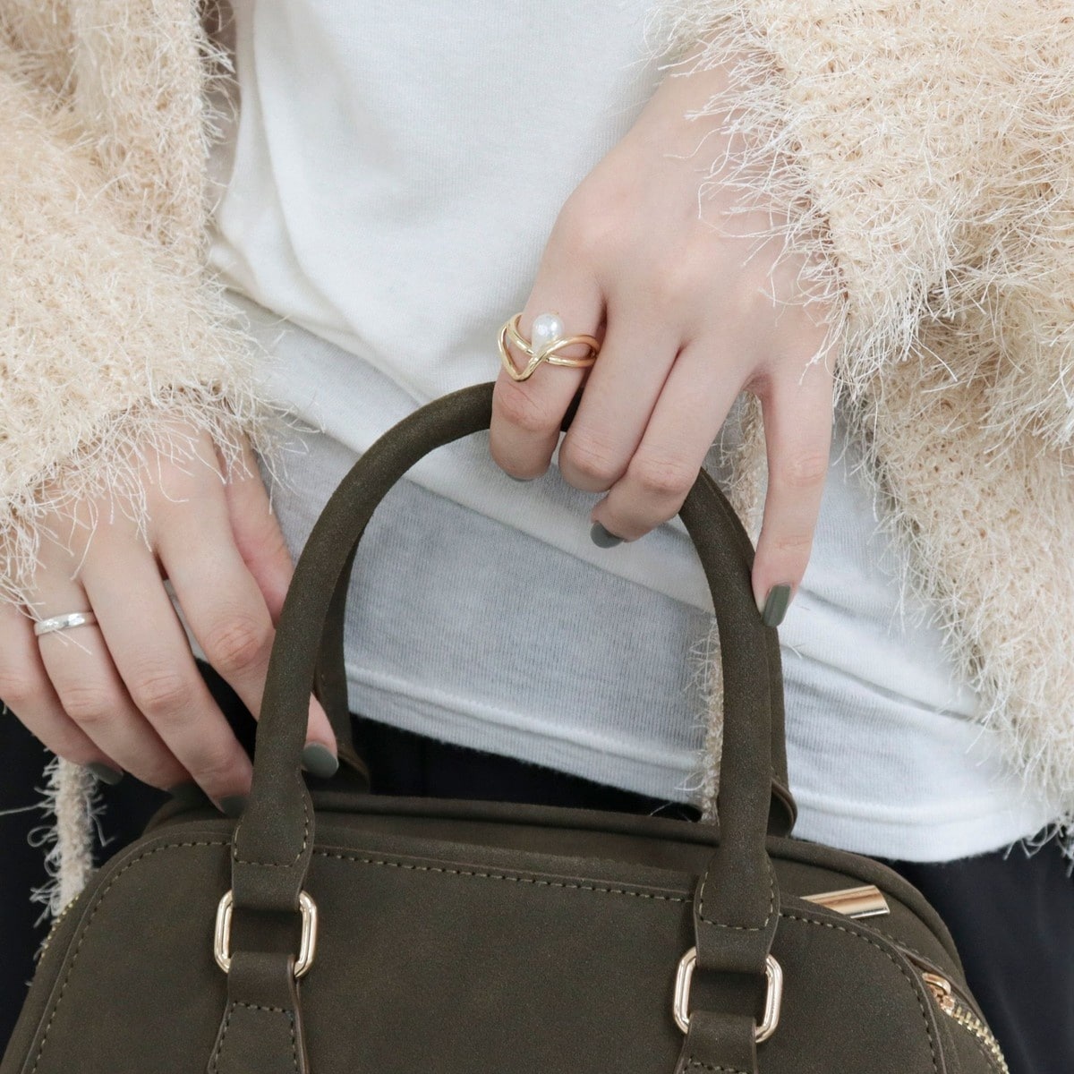 ・大胆なラインデザインが印象的なリングに揺れるパールをあしらった上品なデザイン