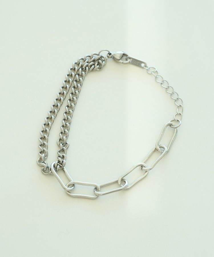 異なるチェーンを組み合わせたデザインのコントラストが印象的なブレスレット。