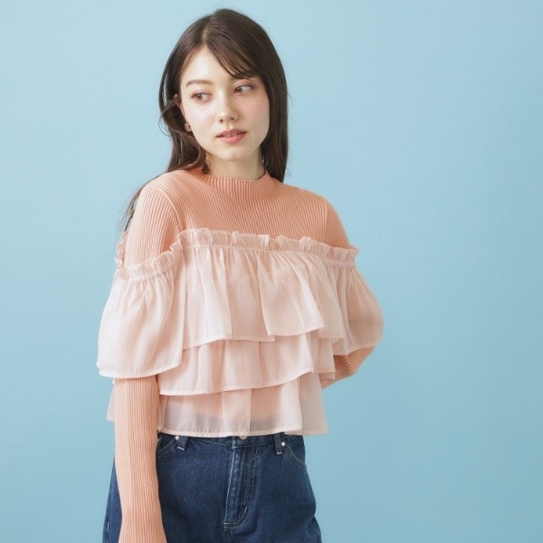 ・リブニットにシアーフリルの布帛ドッキングデザインで、キャッチーかつユニークなスタイルが楽しめます。