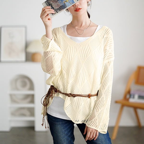 トップスとして着回しやすい紐ベルト付き透かし編みアシメニット。ゆったりとした身幅と肩まわりにVネックを組み合わせた、抜け感のあるデザイン。裾はアシンメトリー仕様でバランスの良い印象に仕上がり。エスニック風の紐ベルトを結ぶことでウエストマークも可能。透かし編みならではの軽やかさがあり、インナー次第で表情が変わるのもポイント。シンプルに程よく個性を取り入れたい、新鮮さをプラスしてくれるアイテムです。