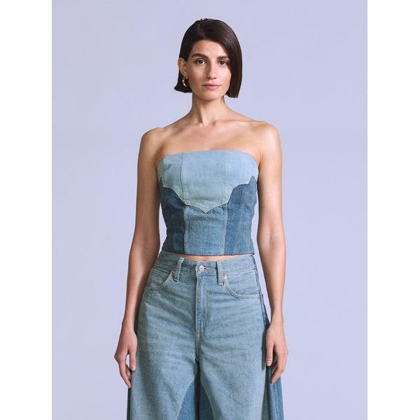 異なるデニムカラーで作り上げたビスチェがBLUE TABコレクションから登場。 ウエスタン調のデザインで一枚でもスタイリングにインパクトを与えることが出来ます。