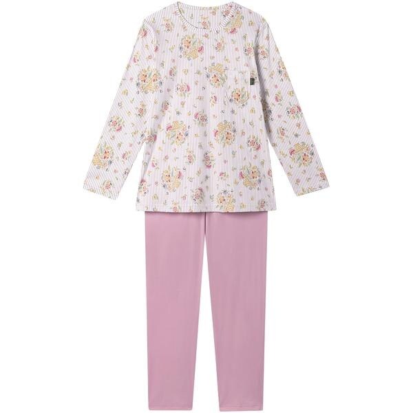 ・本体に、毛羽の少ない細番手の糸を使用し、さらに、生地表面の毛羽を取る特殊な加工をほどこした綿100%のスムース素材を使用・しなやかで、なめらかな肌ざわり・トップスはピンストライプの地模様に食器柄の〈ハドンホール〉トレリスと小花を全体に散りばめた、華やかですっきりとした印象のデザイン・ボトムの両サイドにポケットあり※〈ハドンホール〉1948年にデザインされ、発売以来、世界中で愛されているロングセラーの図柄。パッションフラワー、パンジー、カーネーションなどが図案化され、東洋的なエキゾチシズムが感じられるデザイン[資料元:(株)川島織物セルコン]※お洗濯は、必ず「取扱い表示」にしたがってください。