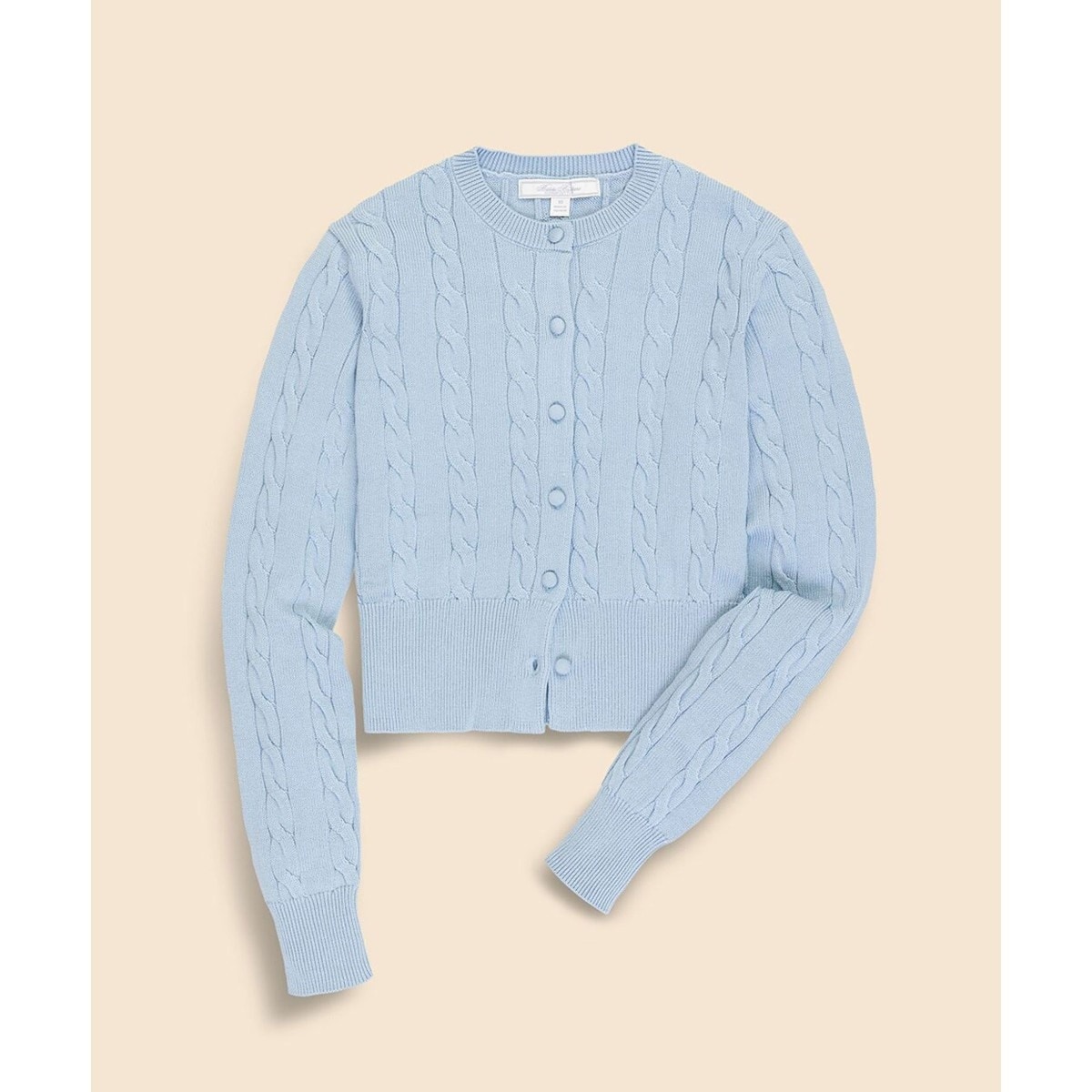 ミドルゲージ(7ゲージ)の上質なスーピマコットンを使用した、クラシックなケーブルデザインのクルーネックカーディガン