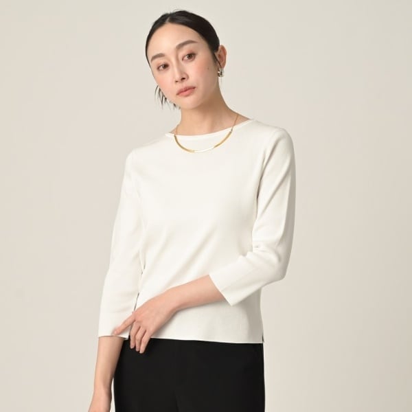 着心地は柔らかでありながら適度なハリ感があり、身体のラインを拾いすぎず、七分袖仕様で程よく肌見せすることで、手首まわりを美しく見せる効果も。