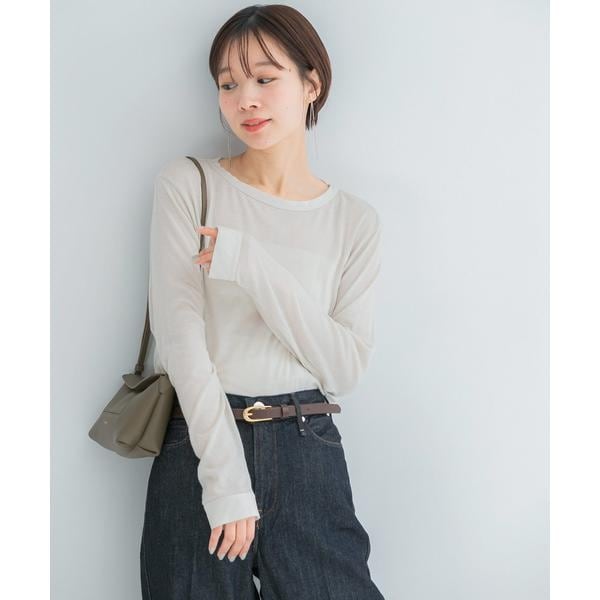 驚くほど軽やかで繊細な質感は、肌に優しく馴染み、春先の柔らかな日差しに美しく映える清涼感のある一枚に。 ほんのりと素肌がのぞくことで、いつもの装いに洗練された抜け感を与えてくれます。首元はベーシックなクルーネックで、どんなボトムスとも好相性。 長めの袖丈が手元にニュアンスを作り、所作まで美しく見せてくれます。一枚で着るのはもちろん、ジャケットやカーディガンのインナーとしても優秀。 ハイウエストのパンツにインすれば、スタイルアップした知的な着こなしに。 デニムと合わせたカジュアルな装いも、シアーな質感のおかげで大人っぽく仕上がります。
