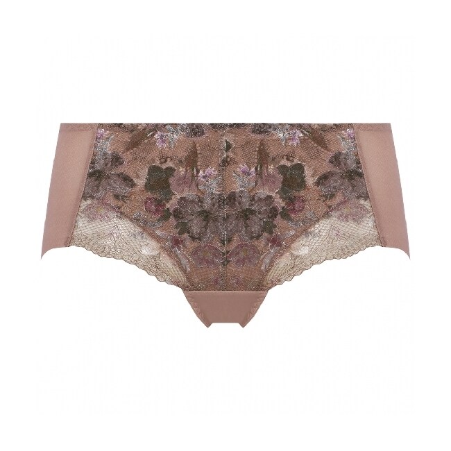 はきこみは浅く、脚口はフロントがレース、後ろは一枚仕立て、ヒップハンガータイプのショーツです。