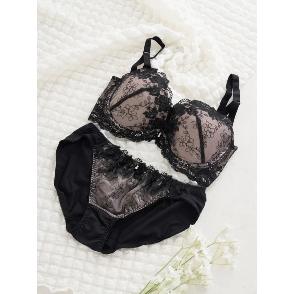 やわらかなムードを演出するフラワー刺繍が施されたブラ&ショーツのセット。