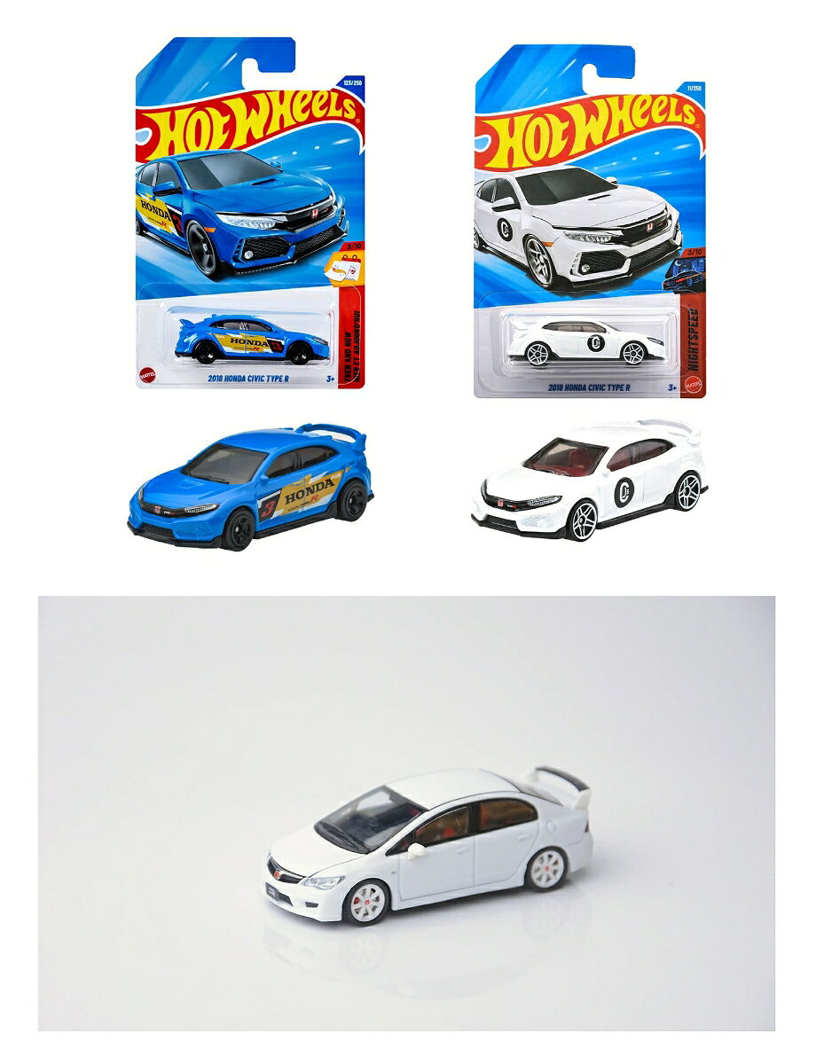 <セット内容>ホットウィール(Hot Wheels) ベーシックカー 2018 ホンダ シビック タイプR 乗り物おもちゃ ミニカー 3歳から ブルー JFN81ホットウィール(Hot Wheels) ベーシックカー 2018 ホンダ シビック タイプR 乗り物おもちゃ ミニカー 3歳から ホワイト JMX20Model1 1/64 ホンダ シビック タイプR(FD2) チャンピオンホワイト 【C33322】 (ミニカー)ーーーーーーーーーーーーーーー◆◇ホットウィール(Hot Wheels) ベーシックカー 2018 ホンダ シビック タイプR 乗り物おもちゃ ミニカー 3歳から ブルー JFN81◇◆【内容】現在のFL5型で6代目を数えるホンダのスポーツカーのアイコン的存在、シビック タイプR。ホットウィールが題材に選んだのは“ガンダムチック”と表現されることが多い現行型の1世代前のFK8型。今回のリリースでは青いボディに、往年の“無限カラー”を彷彿とさせる白×金基調のグラフィックスが良く似合っている。【注意】ブリスターカードの裏面は日本語パッケージとなります。【原産国】マレーシア【対象年齢】3歳〜◆◇ホットウィール(Hot Wheels) ベーシックカー 2018 ホンダ シビック タイプR 乗り物おもちゃ ミニカー 3歳から ホワイト JMX20◇◆【内容】1997年、6代目シビックのマイナーチェンジの際に、サーキット走行も視野に入れた高性能グレード、タイプ Rが追加された。ホットウィールが題材に選んだのは現行型の1世代前のFK8型。“ガンダムチック”と表現されることが多いアグレッシブなデザインが特徴で、登場間もなくの2017年、ドイツのニュルブルクリンク(サーキット)の北コースで、当時のFF車世界最速記録を達成している。今回のリリースでは純白のボディに、日本車の改造部品を製造するChasing JS社のロゴが映えるデザインとなっている。【注意】ブリスターカードの裏面は日本語パッケージとなります。【原産国】マレーシア【対象年齢】3歳〜◆◇Model1 1/64 ホンダ シビック タイプR(FD2) チャンピオンホワイト 【C33322】 (ミニカー)◇◆●HONDA公式ライセンスモデル。初回フレームレッドとチャンピオンホワイトの2色展開。フロントカバーの開閉ギミックに加え、エンジンルームも精巧に再現されています。各色とも限定999台のみの生産。実車のディテールを忠実に再現。保管や展示に最適なクリアケース付き●対象年齢:15歳以上