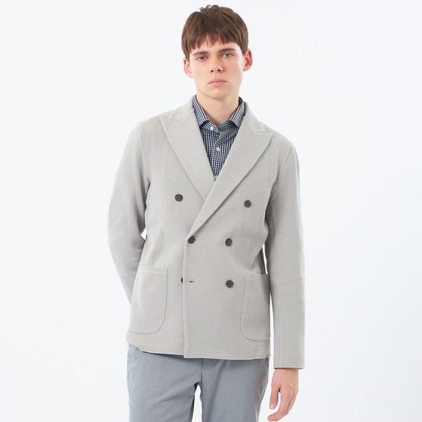 ダブルブレスト、腰パッチポケットのニットジャケット。編立と縫製の使い分けにより、カーディガン感覚で羽織れるリラックス感が特徴です。
