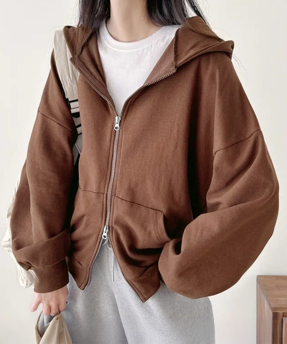 フード付きの上下開きファスナースウェットアウター。
