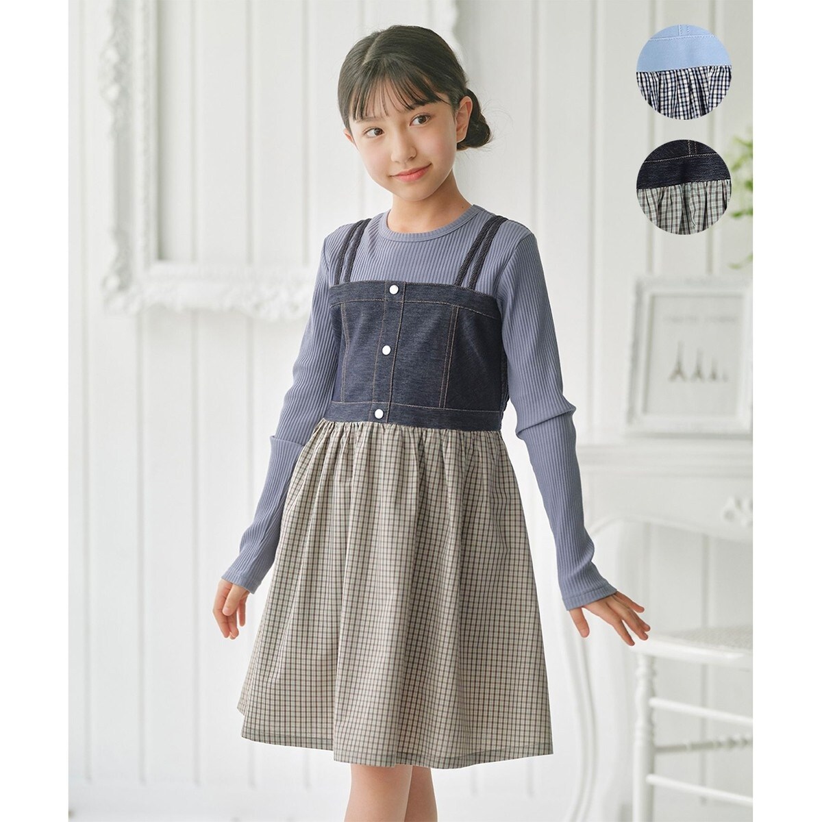 ■デザインリブトップスにデニムのビスチェとチェックのスカートを合わせたたような、一枚でおしゃれなレイヤードスタイルが楽しめるワンピースです。