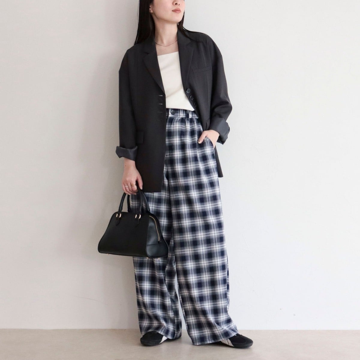 ・コーデの主役になる大き目のチェック柄が目を惹くワイドパンツ