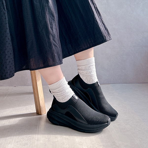 足を入れた瞬間にやさしく包み込む、ストレッチ素材の履き口が心地よいフィット感を叶える厚底スリッポンシューズ。