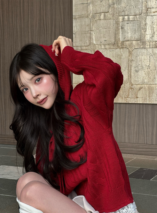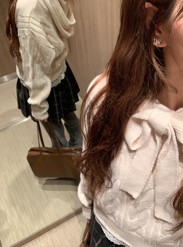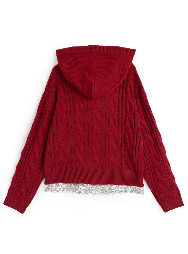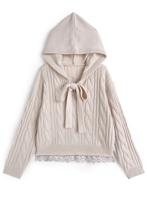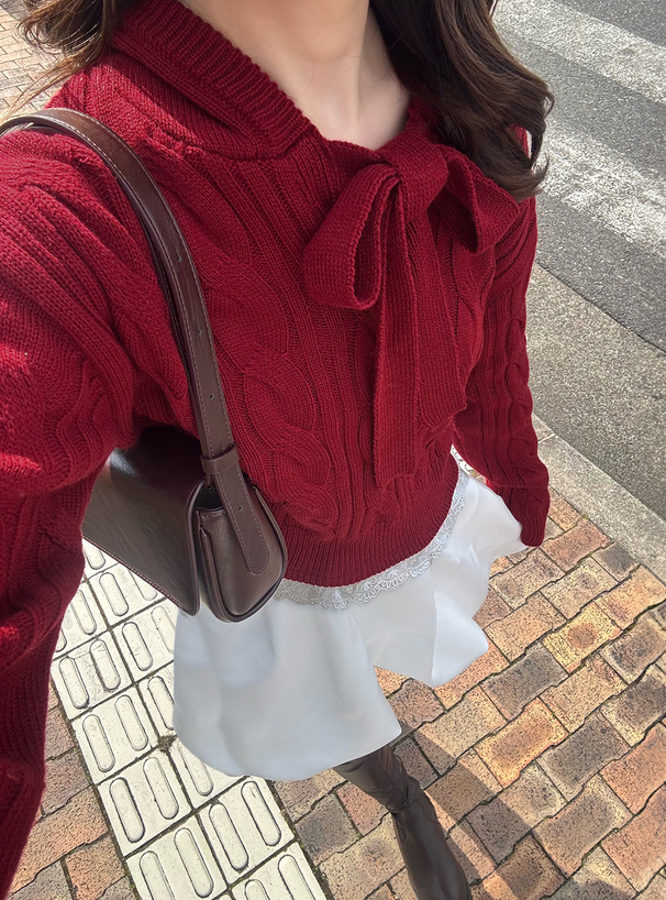 立体感溢れるケーブル編み模様のニットで仕立てたトップス。