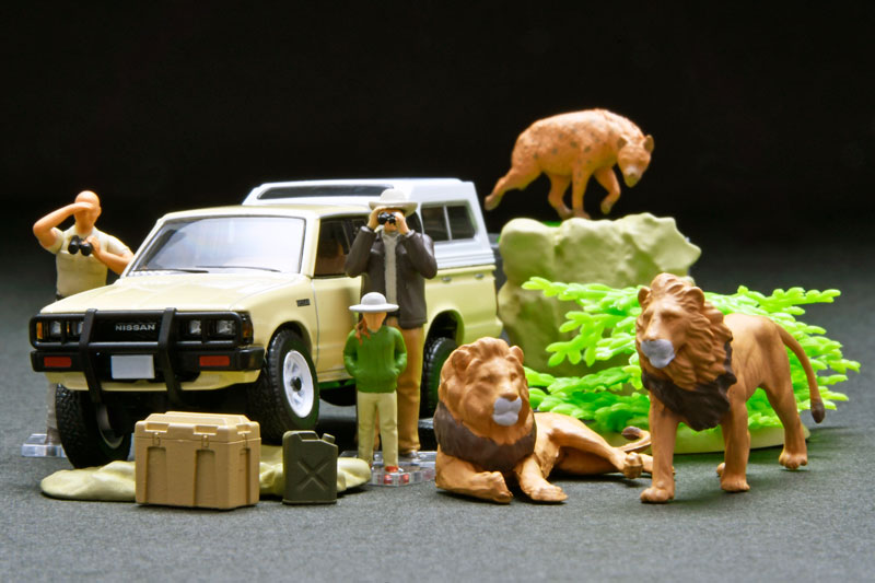 アフリカの「サファリ」をテーマにしたフィギュア・小物のセット。ライオン、ハイエナ、ツアーガイドと観光客、低木が本製品に付属の役者たちです。ニッサン トラックの荷台にスペアタイヤ、ジェリカンを載せれば旅の準備は万全。立ち姿の人のフィギュアには、自立させるのに便利な台座がそれぞれ付属するのでお手軽に並べて楽しめます。