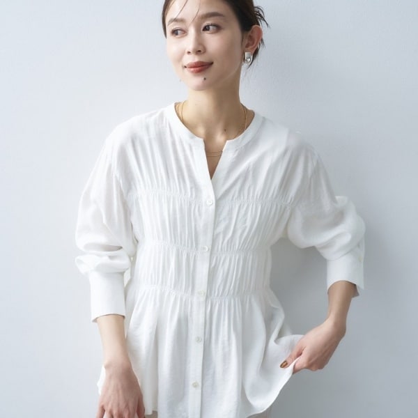 フロントに施されたシャーリングが特徴的なブラウスです。