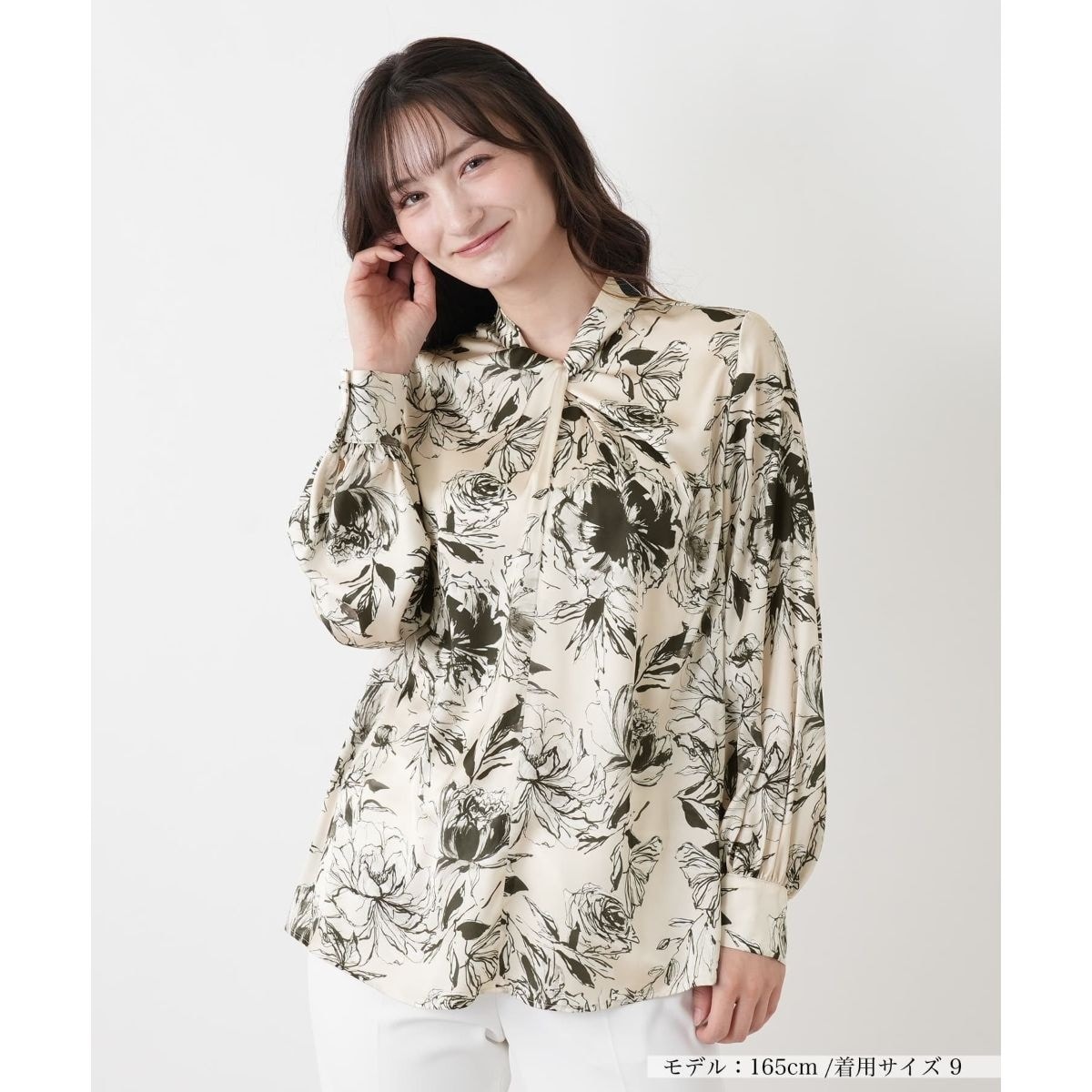 手描きライクなボタニカル柄が、大人のエレガンスを際立たせるプリントブラウスです。フロントにあしらわれたボウタイ風のドレープが顔周りに華やかさと立体的な美しさを添えます。さらりとした軽やかな素材感は初夏の爽やかなスタイリングにぴったり。バックスタイルのファスナーやカフスボタンなど、細部までこだわりを感じる仕立ても相俟ってワンランク上の女性らしさを演出します。一枚でコーディネートの主役になれる上品で都会的なアイテムです。