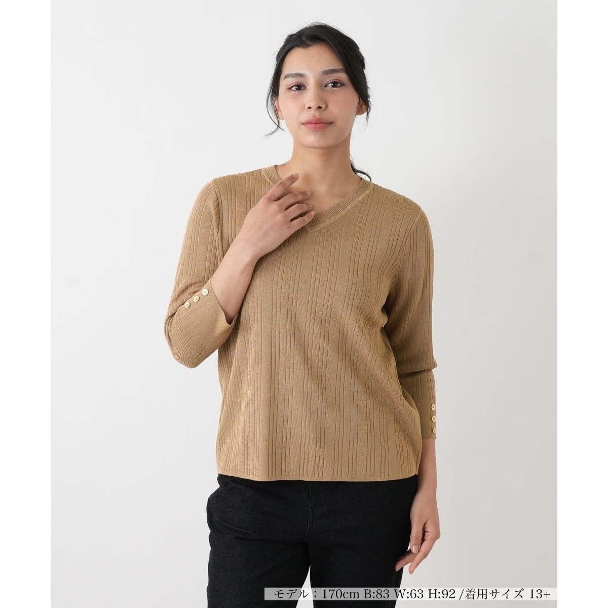 縦のラインを強調するリブ編みが、身体に程よくフィットし、すっきりとしたシルエットを描き出します。浅めのVネックがデコルテを美しく見せ、顔まわりに上品な印象をプラス。七分袖の袖口にあしらわれたボタンが、手元の仕草にさりげないアクセントを添えます。なめらかでほのかな光沢感のある編み地が、装いに豊かな表情を与えてくれる一着です。
