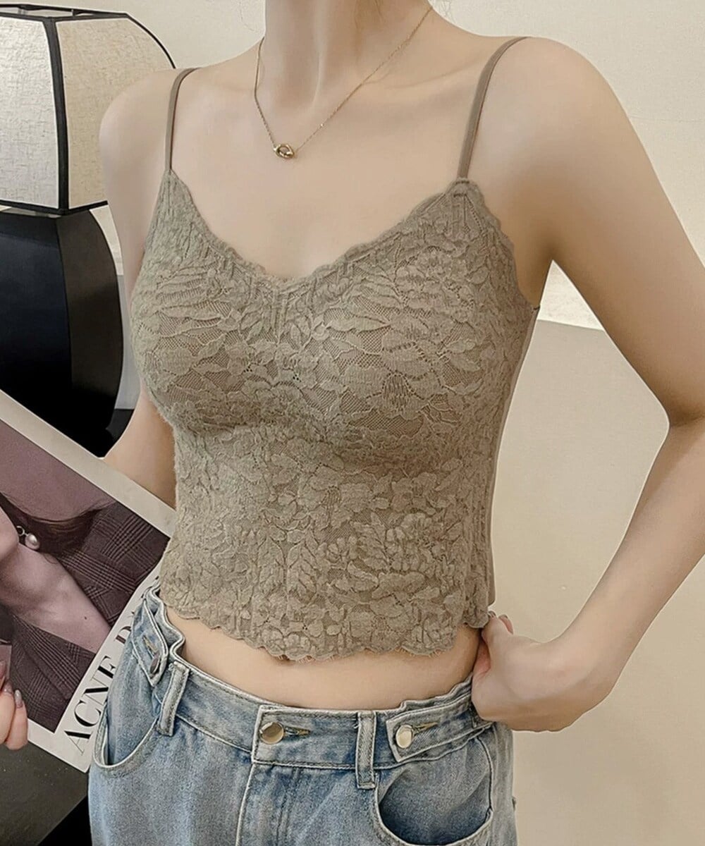 フロントにレースが施された、カップ付きのクロップド丈キャミソール。