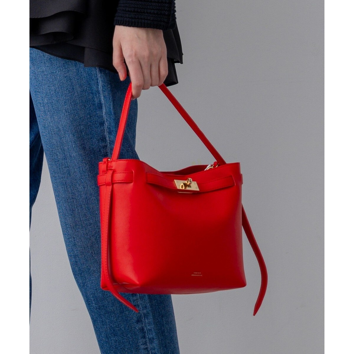 フロントにあしらわれたベルトとゴールドの金具が、クラシカルで上品な印象を与えるハンドバッグです。スムース調のフェイクレザーを使用しています。両サイドに垂らしたベルトデザインが、動くたびにさりげないアクセントとなり、洗練された雰囲気を演出します。 サイズは幅20cmほどのコンパクトな大きさながら、しっかりとマチがあるため見た目以上の収納力を発揮。内部にはファスナーポケット付きの仕切りがあり、スマートフォンや小物類の整理整頓もスムーズに行えます。 トップハンドルでハンドバッグとしてエレガントに、付属のストラップでショルダーバッグとしてアクティブにと、シーンに合わせて使い分けができる2WAY仕様です。きれいめなパンツスタイルでオフィスに、デニムと合わせて休日のランチにと、オンオフ問わず活躍します。 カラーは、シックでコーディネートを引き締めるブラック(#005)、柔らかく女性らしい印象のベージュ(#033)、スタイリングの華やかな差し色になるレッド(#010)の3色展開です。