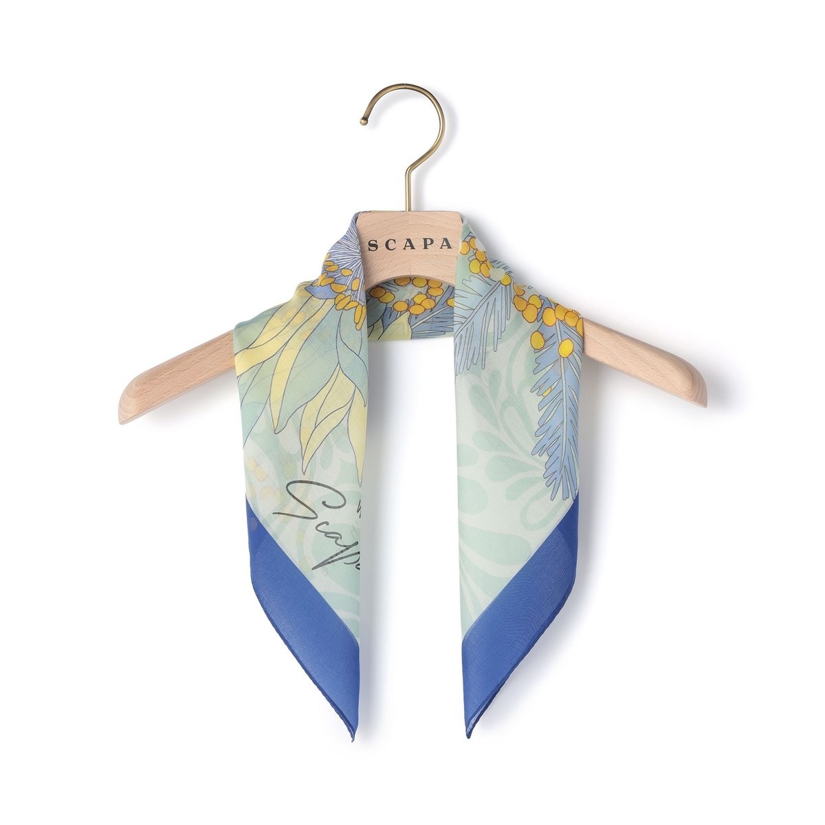 大きなフラワーモチーフが描かれた華やかなスカーフ。落ち着いたトーンのカラーで様々な着こなしにマッチ。折り方によって異なる印象を楽しめるのもポイント。首に巻いたり、ヘアアクセサリーとして使用したりアイディア次第で様々な用途で活躍します。いつものコーディネートにプラスしてエレガントな雰囲気を演出します。