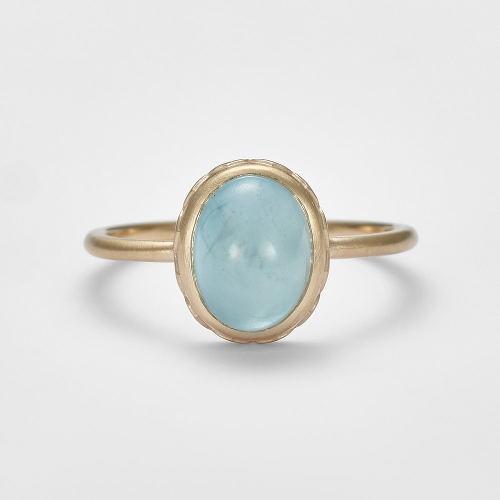 やわらかなブルーが魅力的なアクアマリンを、カボションカットで仕上げたリング。みずみずしい透明感と穏やかな輝きが、装いにさりげない華やぎを添えます。石枠にはクラフト感のあるマットで仕上げ、艶やかな石の美しさを際立たせています。少し大きめのサイズが、ひとつでもしっかりとした存在感を放ちます。柔らかな色合いは、春のスタイルに自然に馴染みます。3月の誕生石としてもおすすめのアイテムです。※天然石や天然素材を使用しているものは、サイズ・色味・風合いの違いや、若干の傷、内包物の有無などに個体差があります。予めご了承ください。
