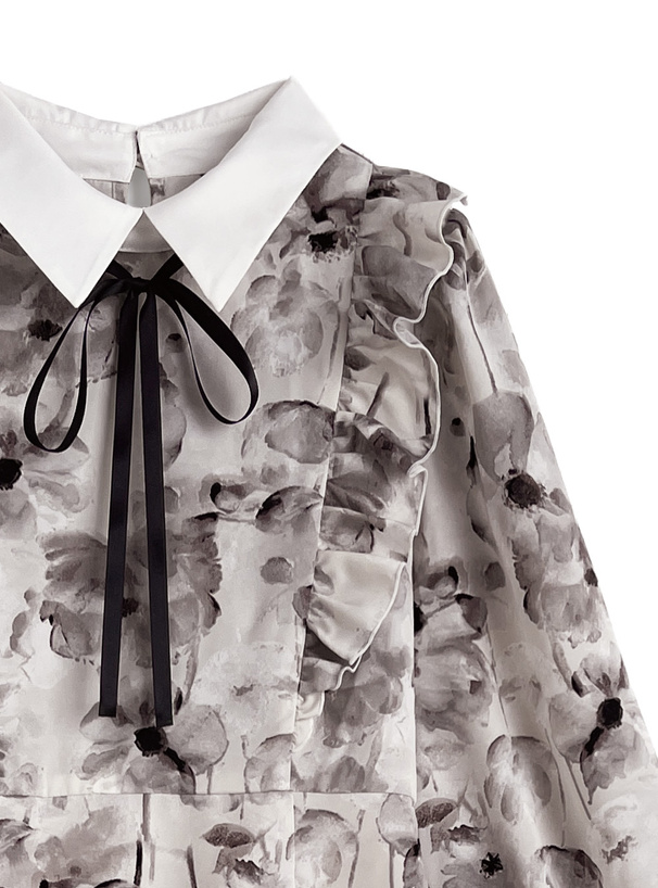 襟デザインに控えめフリルが清楚で、付属のリボンタイを結べばさらに女性らしさ溢れるルックスに。
