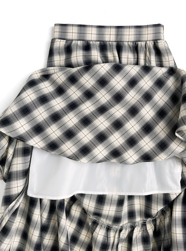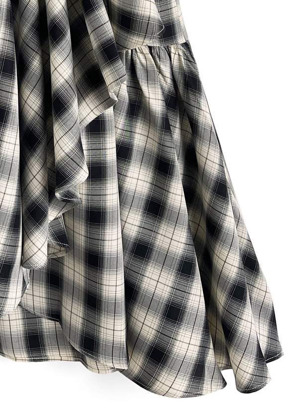 斜めに切り替えられたアシンメトリーなフリルがシルエットに動きをプラス。