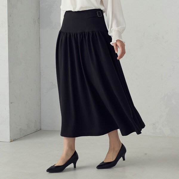 ミドルヒップで切り替えられ下の部分にはたっぷりとしたギャザーフレアが入り、