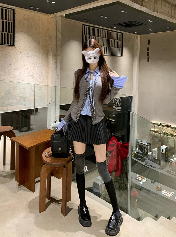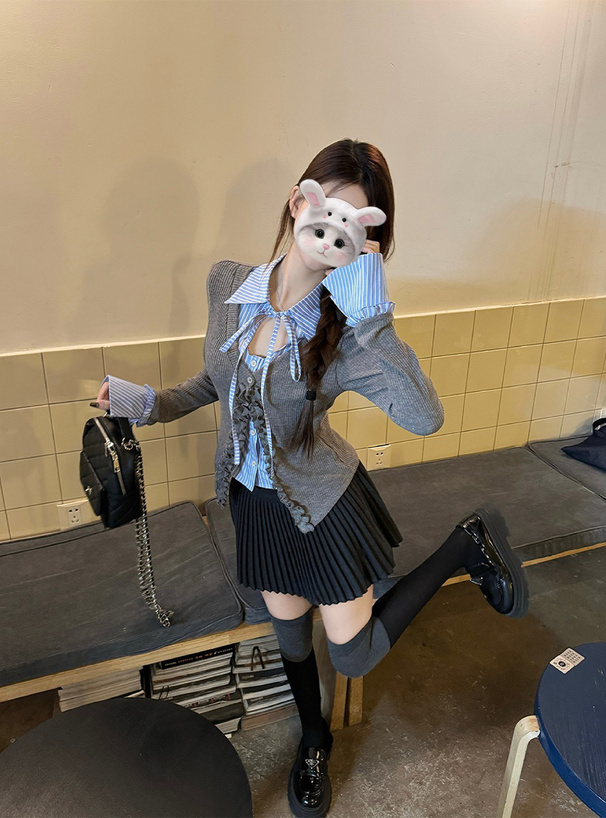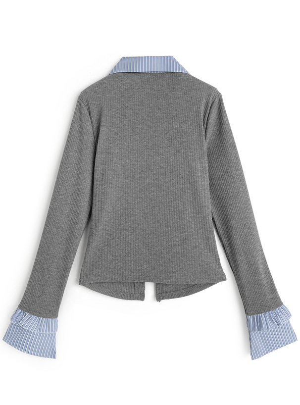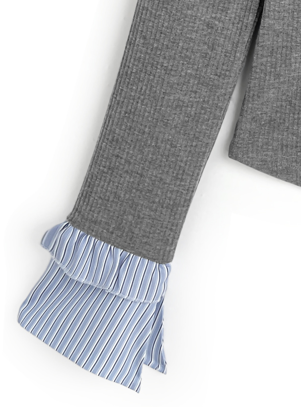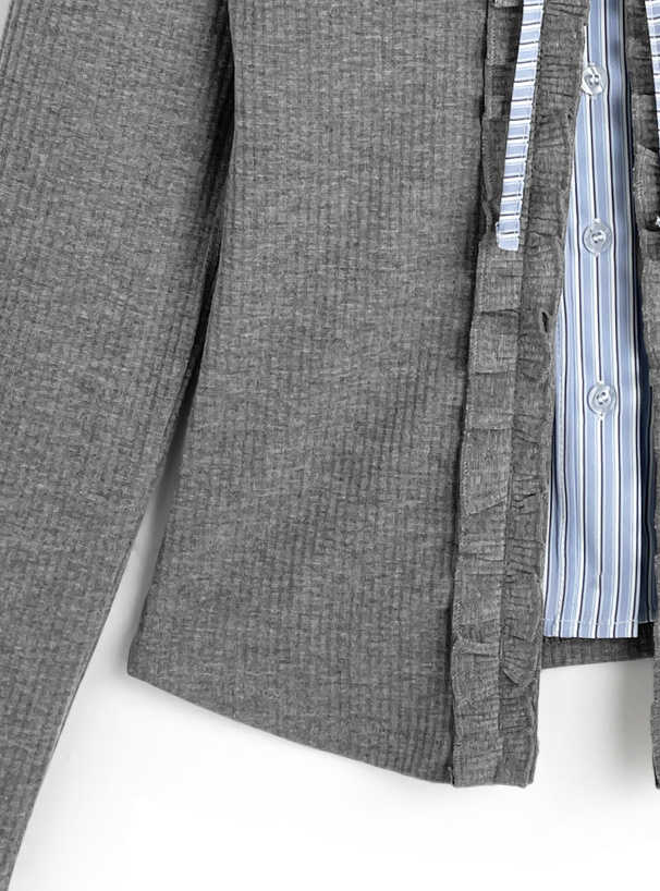 ストライプ柄シャツにカーディガンを重ね着したようなドッキングデザイン。