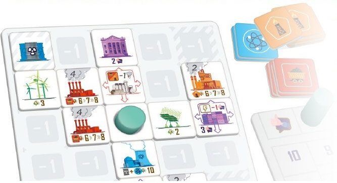プレイヤーは各自が架空都市の市長となり、自らの都市に安定的な電力供給を行うためエネルギーの発展計画を策定します。都市内に石炭・石油・再生可能エネルギー、そして原子力の発電所をバランスよく配置し、より多くの発電量を確保していくことで勝利を目指します。ただし、各種の発電所が生む大気汚染や放射性廃棄物の問題などを解決し、市民の支持率とのバランスを取っていかなければなりません。建物や燃料のタイルをいかに思う通り手に入れ、ボードの適切な場所に建設できるか、という部分に、プレイヤー間の濃密な駆け引きが集約されています。ドイツから生じたボードゲームの様々なアイデアを継承しつつ、明快かつ視認性にも優れた、まさに理想的なボードゲームとなっています。
