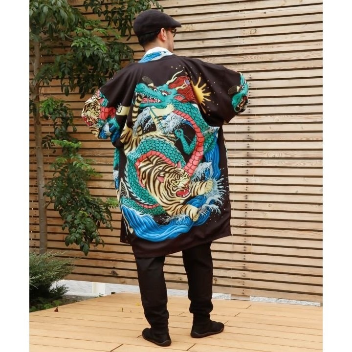 【倭物やカヤ×鈴木ひょっとこ】コラボのリバーシブル羽織り。伝統×現代の融合を魅力的に描く、画家・鈴木ひょっとことのコラボ商品。描き下ろしの「龍虎」、「風雷」「ミーアキャット」が大胆に描かれ、表裏で異なる表情を楽しめるデザインです。さらりとしたポリエステル素材で扱いやすく、和装にも洋服にも合わせやすいユニセックスデザイン。現代に映える新感覚の和スタイル羽織りです。