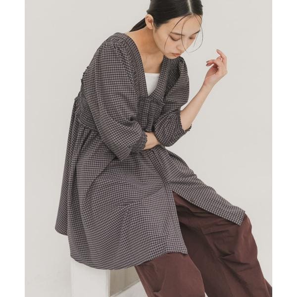 衿と胸下のシャーリングデザインがポイントになった、チェック柄を採用したミニワンピース。少しゆるめのシャーリングになっているので、締め付け感なく着ていただけます。表情が異なる前後2WAY仕様も嬉しい。ミニワンピースですが、デニムやロングパンツを合わせたレイヤードスタイルもおすすめです。