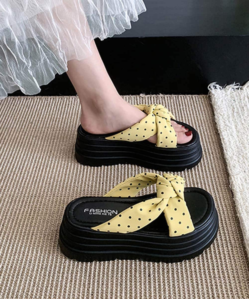 大きめリボンとレトロなドット柄が目を引く、ガーリーな厚底サンダル。