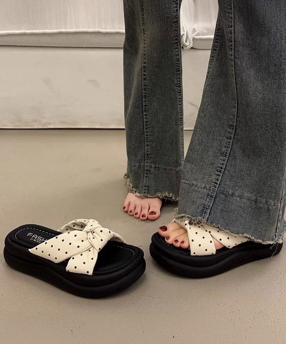 大きめのクロスリボンがアクセントになった、ドット柄の厚底サンダル。