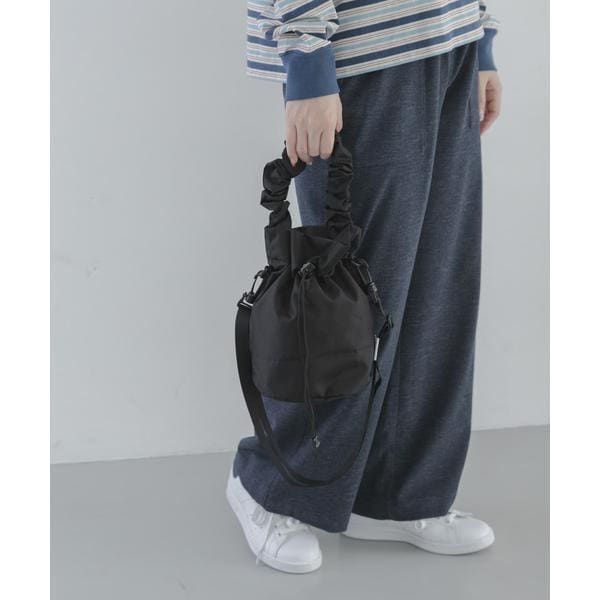 ハンドル部分のギャザー仕様が印象的なショルダーポーチ。内側には小物類の分類収納に最適なオープンポケット、ショルダーストラップは取り外し可能なのでシンプルなミニトートバッグの様な見た目も楽しめます。また天面部分の紐を絞って巾着バッグ的な使い方も可能です。