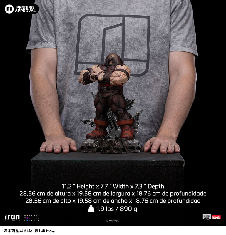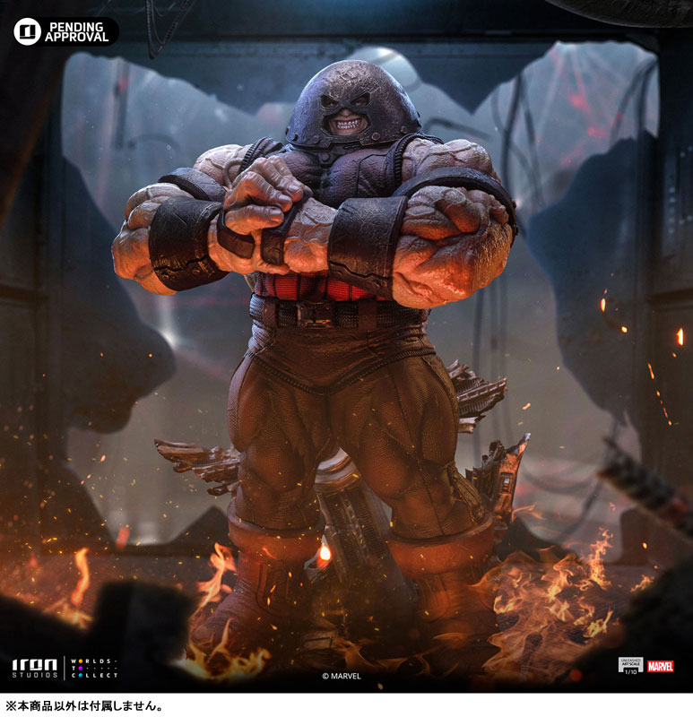 コミック版のジャガーノートを、高さ約29cm、1/10スケールのスタチューとして立体化。細部に至るまで精巧に造形し、こだわり抜いた仕上がりだ。すべてハンドペイントによって塗装が施されているぞ。差し替え用ヘッドが付属し、2通りの姿でディスプレイ可能だ。台座は、崩壊したX-マンションが造形されたジオラマ仕様となっている。