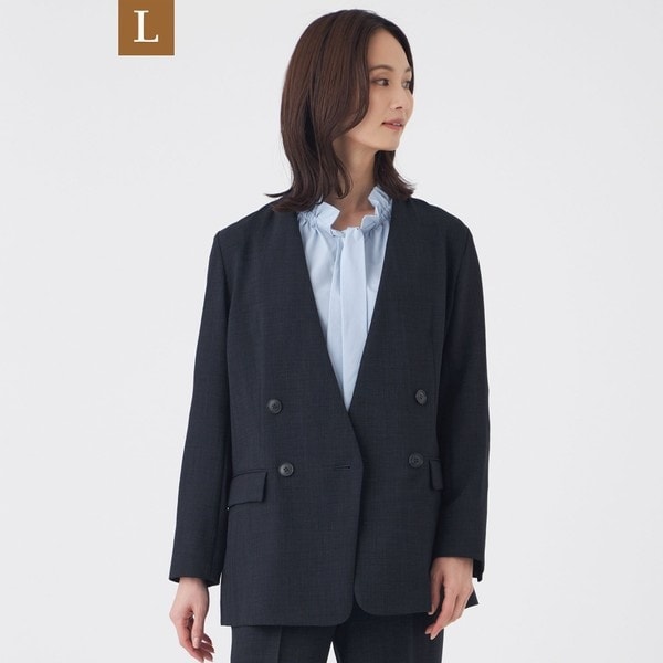 吸水速乾機能付きのVネックノーカラーのダブルブレストジャケットです。