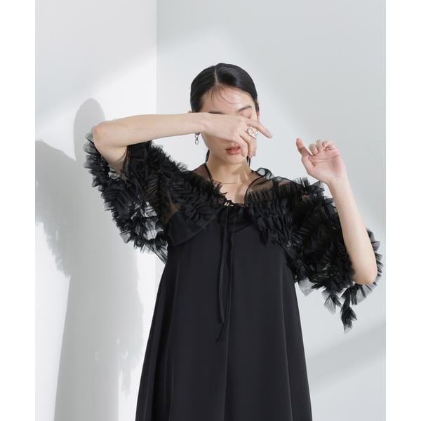 存在感のあるボリュームチュールが可愛いtroisiemechacoのボレロ。袖無しやキャミタイプのワンピースやブラウスの上からレイヤードするだけで、一気に華やかなオケージョンスタイルにアップデート!結婚式やパーティーなどのお呼ばれシーンに一目置かれるデザインです。