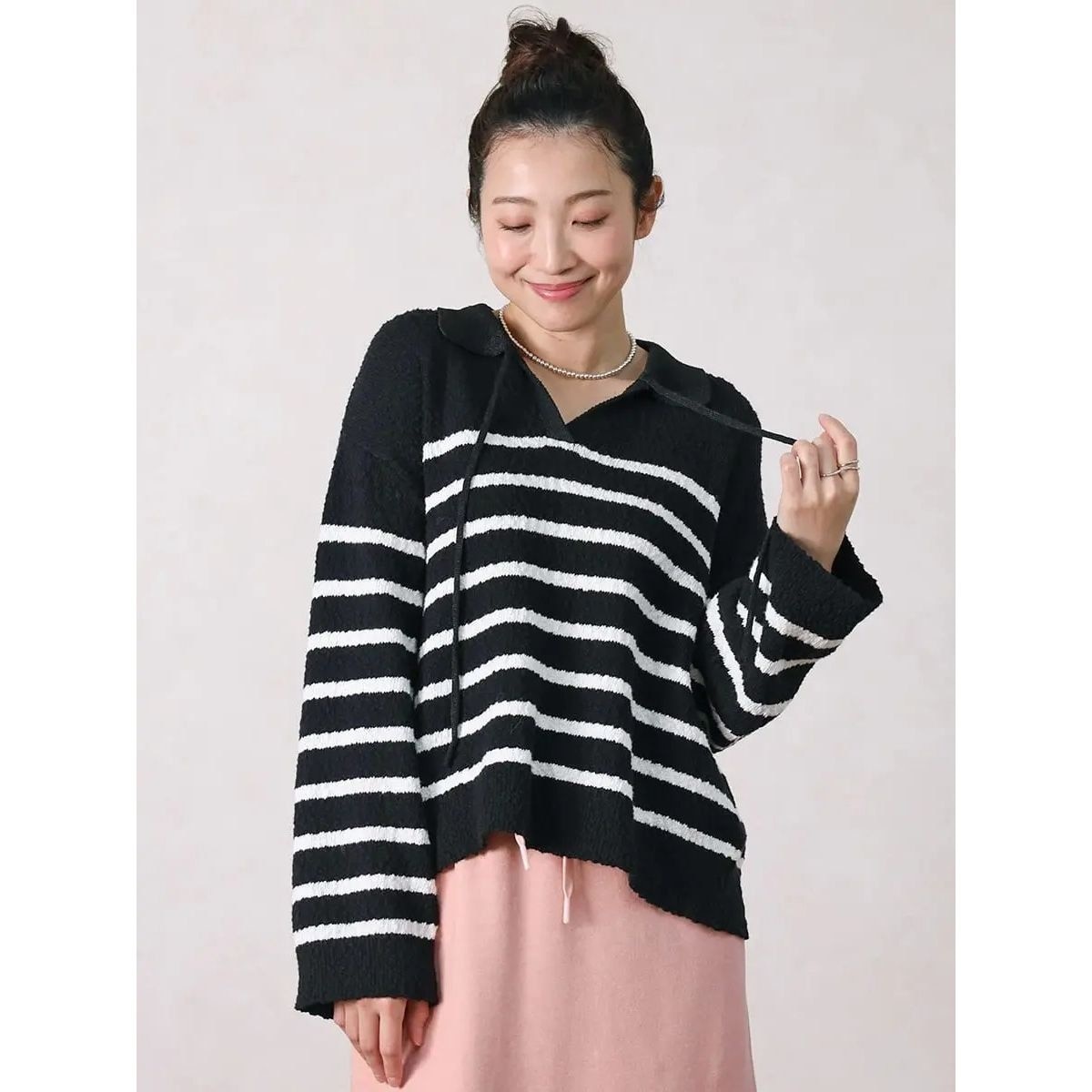 表情感のあるスラブ糸で編み立てた、ボーダー柄の襟付きニット。