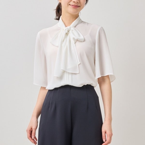 やわらかな落ち感を楽しめる薄めのジョーゼット生地を使用した半袖ブラウス。前身頃にタックとボウタイを施したプルオーバータイプで、スタイリングに華やかなアクセントを添えます。二の腕をきれいにカバーする半袖がポイント。スリーブはややフレアなシルエットになっているため、動くたびに自然な揺らめきを演出します。ボトムスにタックインしたメリハリのある着こなしがおすすめです。