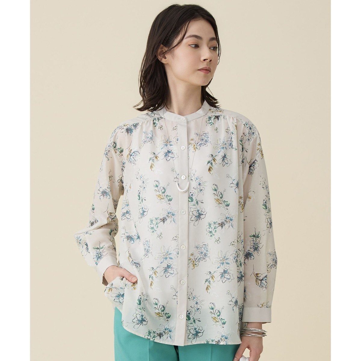 ひと足先の軽やかさを楽しむ花柄シアーブラウス■デザイン前後のヨークにたっぷりとギャザーを寄せた、柔らかな印象のバンドカラーブラウスです。程よいシアー感と柔らかな素材を使用することで、裾に向かって自然に広がる、しなやかなフレアシルエットになっています。繊細な花柄をあしらうことで、装いにやさしい華やぎを添えました。主張しすぎない柄使いで、コーディネートに自然となじみます。同素材のスカート(SKWRLM0319)と合わせていただくことで、セットアップ風の着こなしもお楽しみいただけます。■素材上品な光沢感と程よいシアー感のある素材を使用しています。セルロース特有のソフトな風合いと落ち感があり、シルエットを美しく演出します。ふんわりと軽やかで、カラーの発色の良さも魅力です。プリント生地には、非常に軽く天然タッチの風合いが特徴のポリエステル素材を使用しています。ご家庭でのお洗濯が可能です。■同素材花柄プリントスカート(SKWRLM0319)プレーンブラウス(BLWRLM0318)プレーンスカート(SKWRLM0318)
