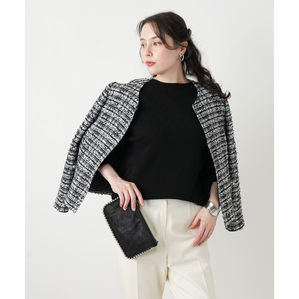 表情豊かな素材感が魅力の、ノーカラージャケット。ナイロン、コットン、レーヨン、ポリエステル、アクリルをブレンドした素材は、暖かみがありながらも、軽やかな着心地です。ノーカラーの丸首デザインは、デコルテラインをすっきりと見せ、洗練された大人の女性の品格を演出いたします。短めの着丈で、スカートやワンピースとの相性も抜群。セレモニーやパーティーシーンにもふさわしい上品な装いを叶えます。冬のフォーマルな場面で自信を持って着用いただける、上質でエレガントな一枚です。