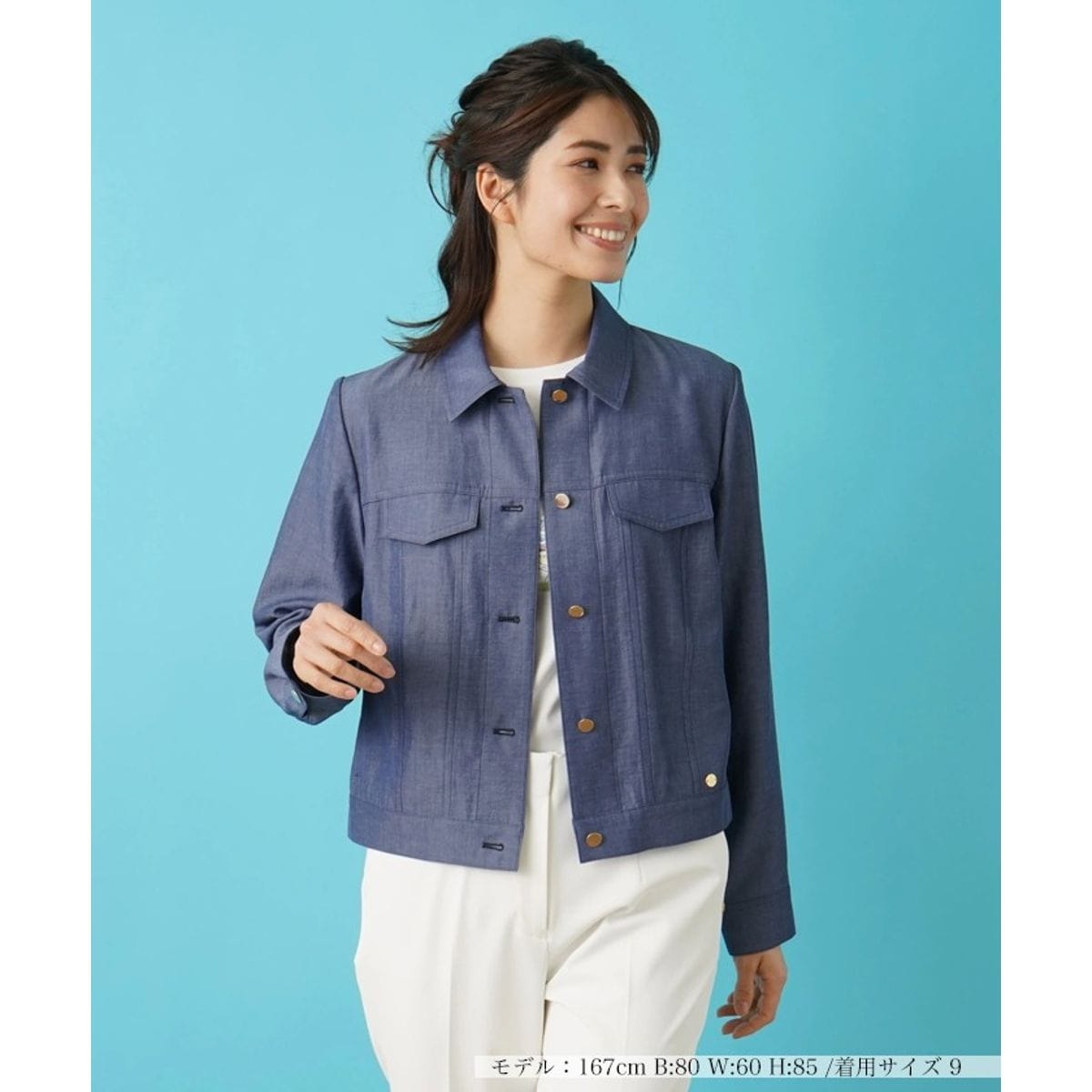 軽やかで心地よい肌触りと、優しい光沢を持つテキスタイルで仕立てられたデニム調ジャケット。カジュアルなアイテムながらも上品な佇まいのスタイリングが楽しめます。洗練されたミニマルなシルエットで、カットソーやワンピースとのレイヤードはもちろん、ワイドパンツやミモレスカートとのコーディネートもナチュラルにバランスよくまとまります。これからの季節の多彩なシーンにマッチする、汎用性の高いアウターです。